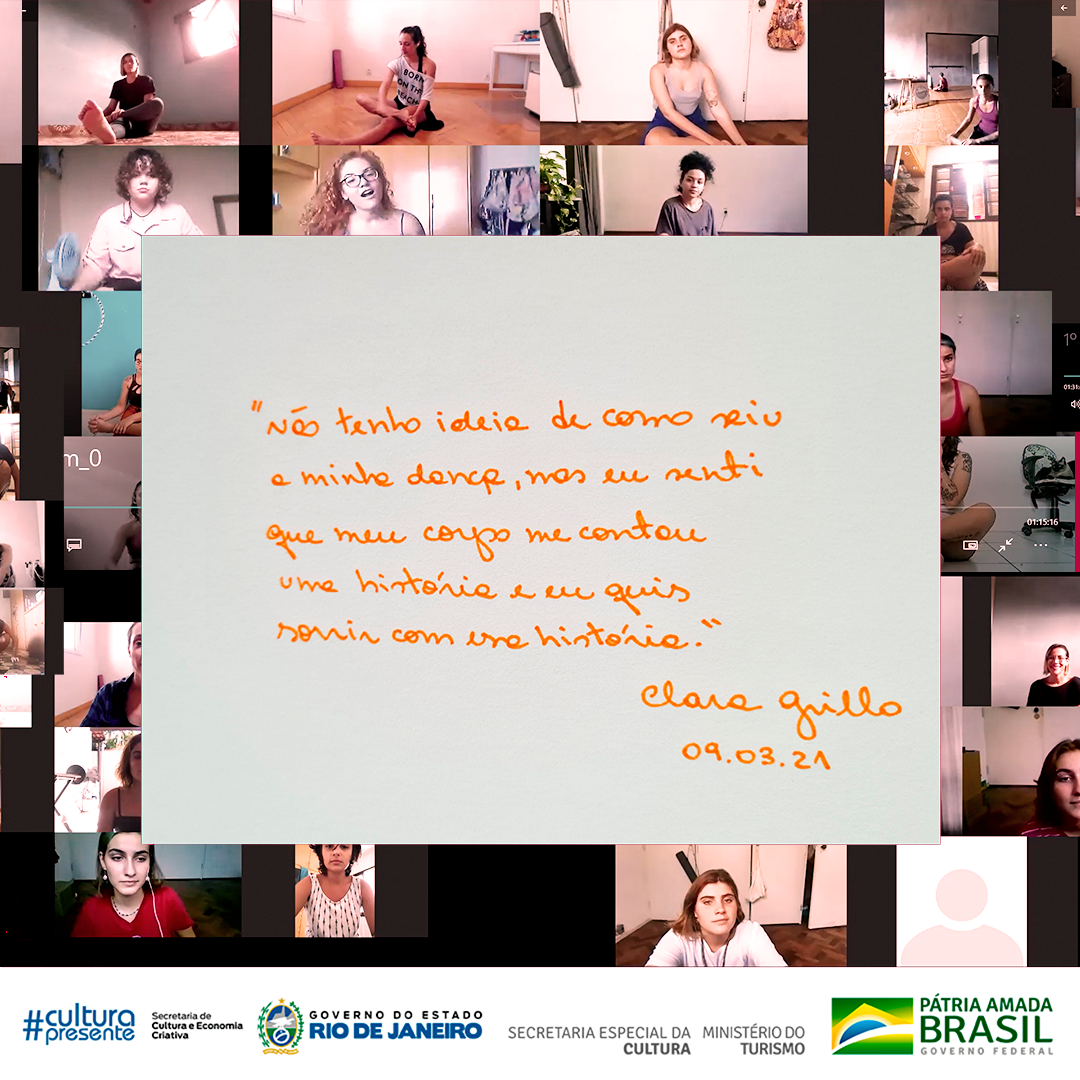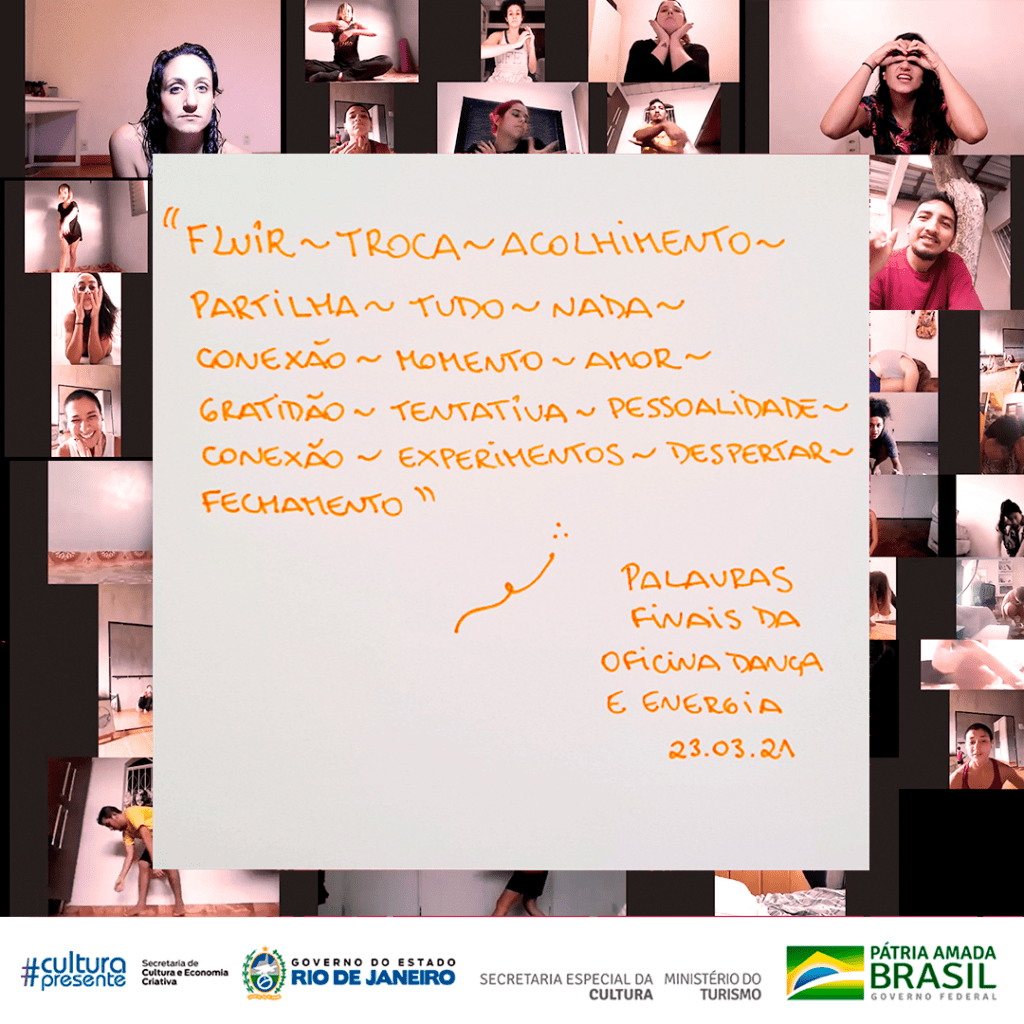 Foram 7 encontros, com a duração de 1h30, onde aprofundamos a compreensão do movimento da energia dos nossos corpos, com base na Dança Contemporânea Intuitiva e na Consciência Corporal, através da plataforma Zoom.
